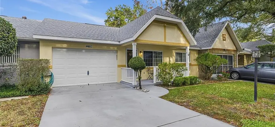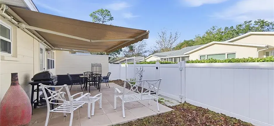 This beautifully maintained 2-bedroom, 2-bath home offers 1,150 square feet of thoughtfully designed living space, highlighted by a custom gourmet kitchen that truly sets it apart. A concrete bump-out addition dramatically expands the kitchen, creating an exceptionally spacious layout. With an abundance of drawers for maximum storage, a built-in desk/office area, and a pantry with convenient slide-out drawers, this kitchen is truly unique—no other home this size will offer a kitchen of this scale and functionality. A mini split has been placed in the kitchen for added comfort. Step outside to enjoy the private outdoor space, complete with a privacy fence and a SunSetter canopy, providing comfortable shade for relaxing or entertaining outdoors. Located within a secure gated golf cart, residents enjoy an unmatched lifestyle with countless amenities, including three golf courses, multiple pools (including an indoor pool), a large fitness center, tennis and pickleball courts, walking trails, pet parks, a community garden, and much more. The community also boasts 175 clubs, a lifelong learning program offering over 1,300 classes, an R/C flying field, and a lively town square that hosts dancing, festivals, fairs, and special events throughout the year. Bring your pets as this community has a pet friendly policy with no wight restrictions. The HOA fee adds exceptional value, covering lawn care, irrigation, exterior maintenance and painting, as well as basic cable, allowing for truly low-maintenance living. This exceptional home offers the perfect blend of comfort, functionality, resort level conveniences perfect for those seeking both an active community and a leisurely hideaway from the hustle and bustle. Featuring a brand-new roof installed in 2024 and offered with partial furnishings, this home is ready, all that is missing is you!